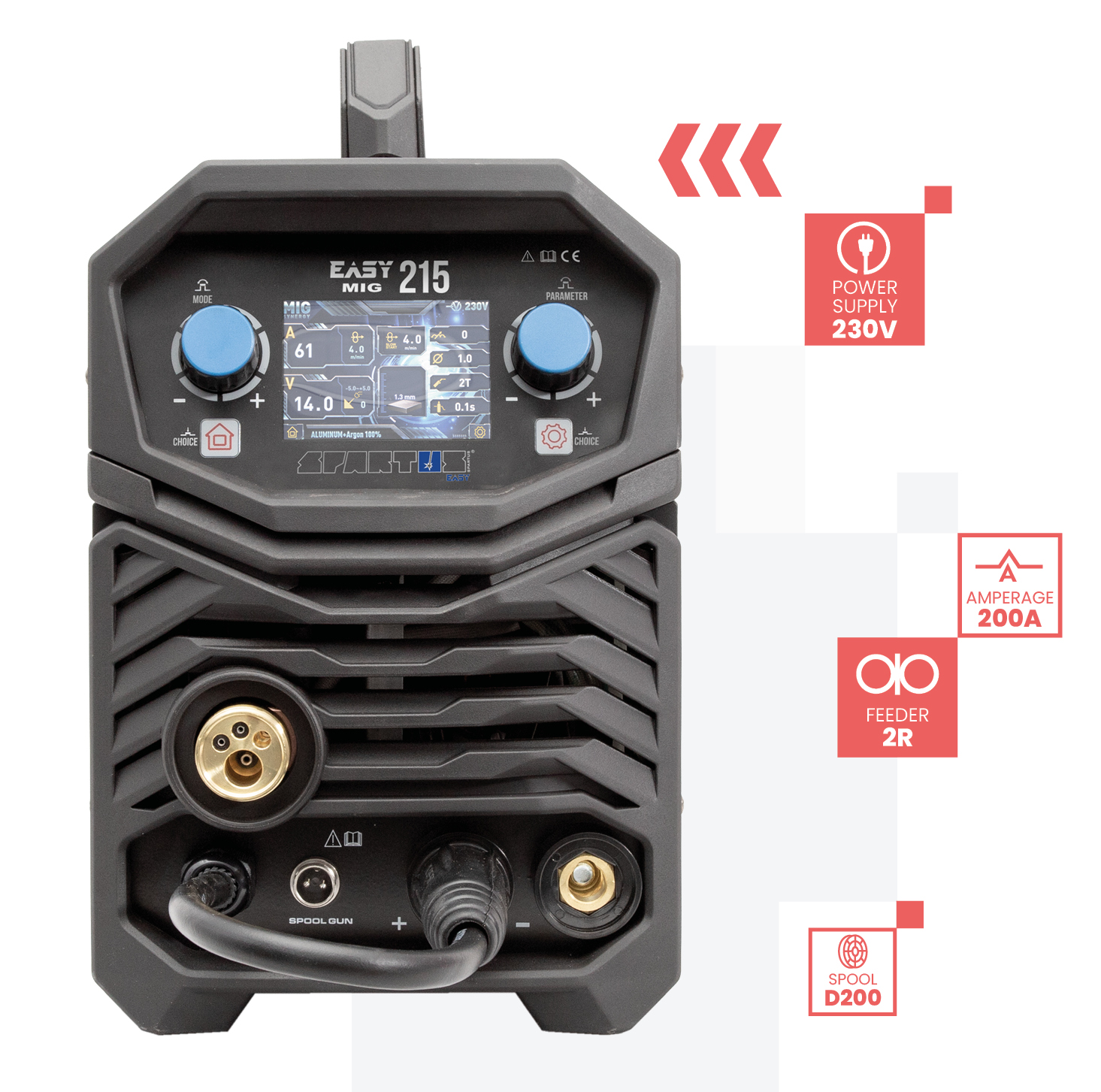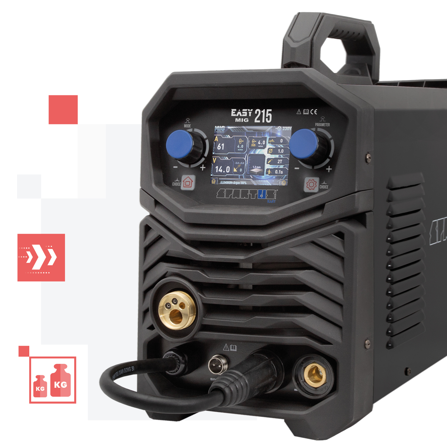 SPARTUS EasyMIG 215 este echilibrul perfect între mobilitate, putere și simplitate. Cu tehnologia Easy Synergy, funcții avansate de sudare și un design durabil, garantează rezultate de înaltă calitate atât în atelier, cât și la fața locului.