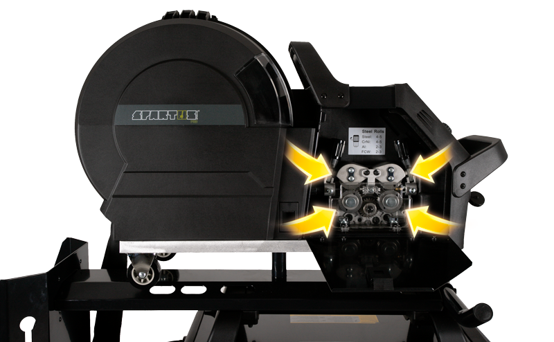 Un alimentator de sârmă precis cu patru role asigură o alimentare stabilă și consistentă a materialului de sudură chiar și sub sarcini mari și cu cabluri de sudură lungi. Gama largă de diametre de sârmă acceptate și posibilitatea de a utiliza bobine mari fac ca dispozitivul să fie ideal atât pentru producția de serie, cât și pentru fabricarea structurilor grele din oțel. Un avantaj suplimentar este posibilitatea de a conecta o torță de tip Spool Gun, care extinde semnificativ gama de aplicații, în special pentru sudarea aluminiului și operațiuni care necesită o stabilitate maximă de alimentare cu sârmă.