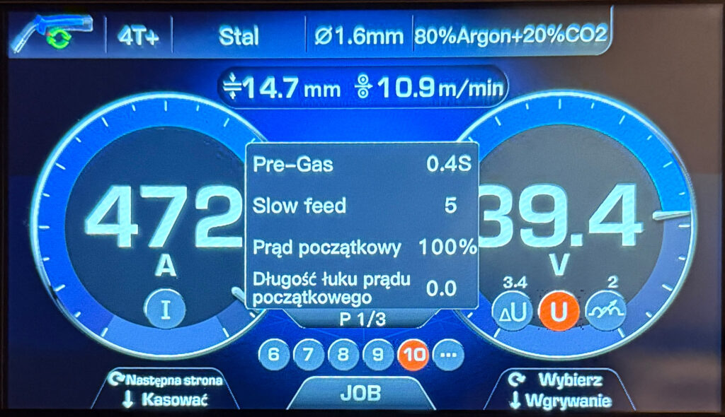 SPARTUS ProMIG 5000 oferă opțiuni avansate de configurare pentru procesul de sudare MIG/MAG, care depășesc setările standard disponibile în mașinile semiautomate convenționale. Utilizatorul are acces la reglarea precisă a parametrilor, cum ar fi timpul de gaz pre-flux și post-flux, arderea înapoi și pornirea ușoară a alimentării sârmei (alimentare lentă), permițând o pregătire optimă a procesului și minimizând defectele de sudură.